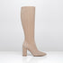 Bota alta en gamuza beige con tacón bloque y punta estilizada: sofisticación neutra para looks que hablan suave, pero fuerte.