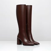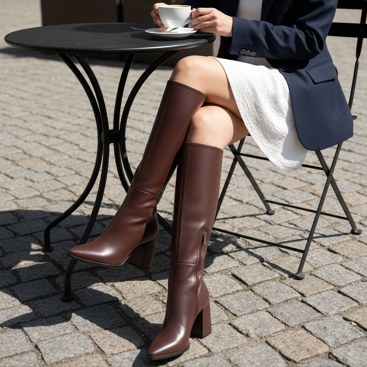 Bota café de caña alta con tacón bloque y punta estilizada: elegancia sobria que se adapta a todo tu clóset.
