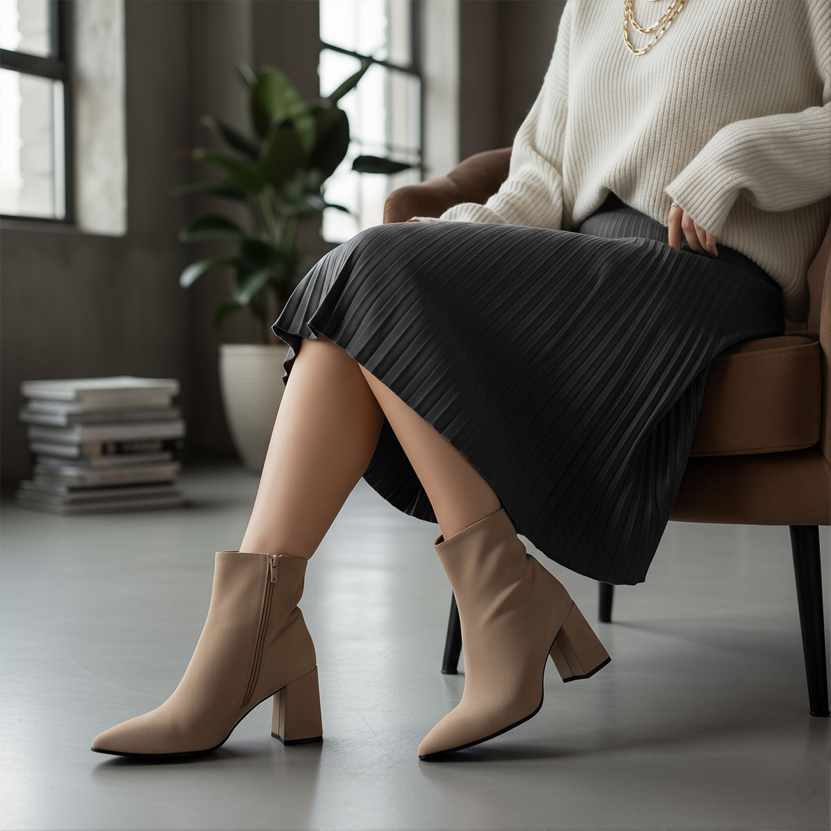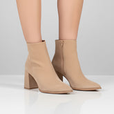 Botín en gamuza beige con tacón ancho y punta estilizada: sobriedad con poder y comodidad que no se negocia.