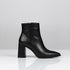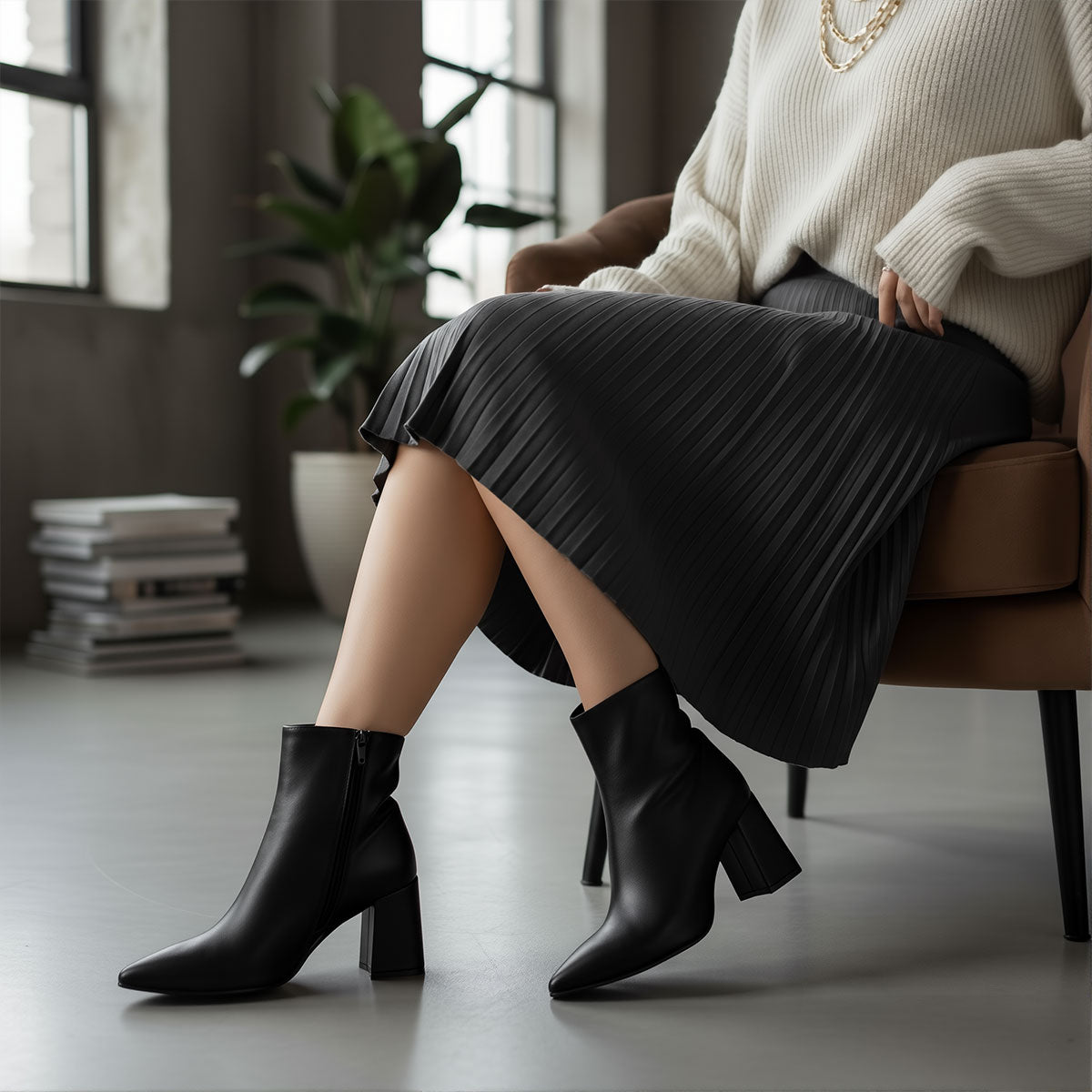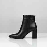 Botín negro en acabado mate con tacón bloque y punta afilada: el clásico infalible que va con TODO y te hace ver imparable.