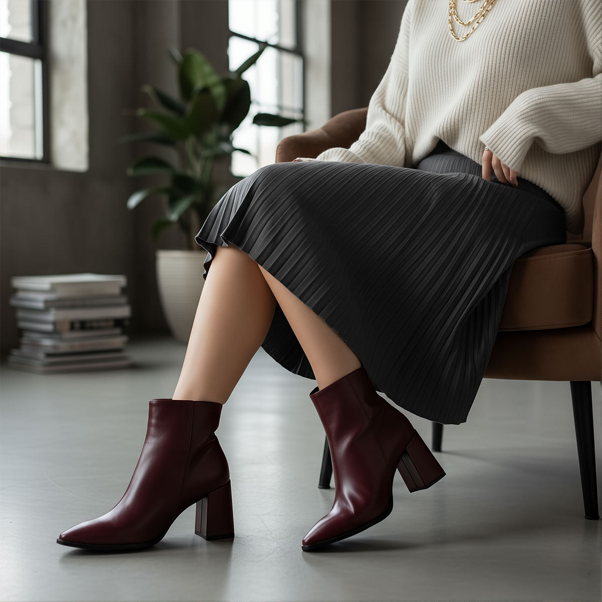 Botines en tono vino con tacón bloque y punta afilada: sofisticación con carácter para looks que marcan diferencia.